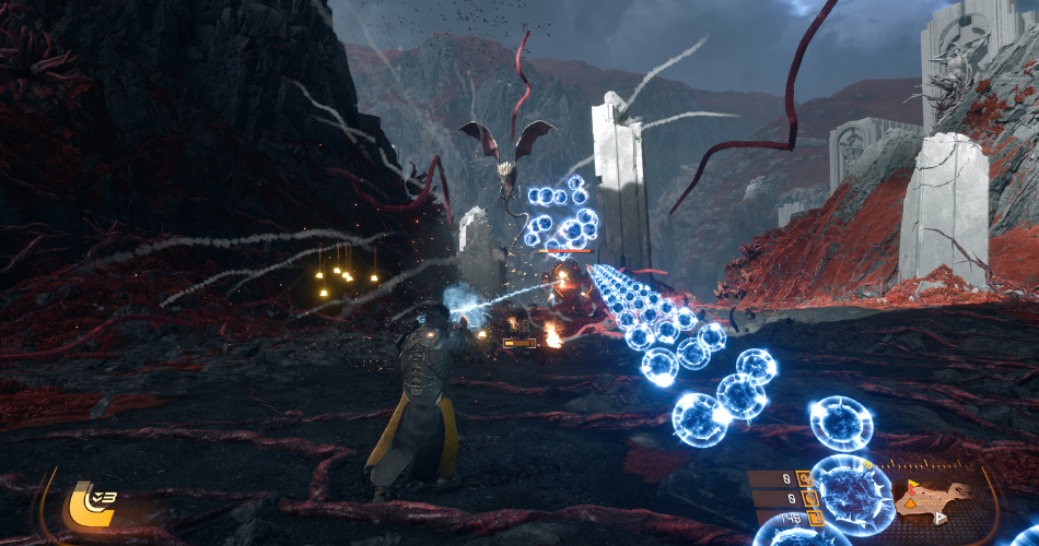 Le cœur du gameplay de Saros, c’est la lecture instantanée du danger. Chaque projectile a un code couleur. Chaque attaque demande une réponse précise. Bloquer. Esquiver. Parer. Tirer. Tout s’enchaîne à une vitesse folle. Et quand tu entres dans le flow, Saros devient presque instinctif. Tes doigts agissent avant ton cerveau.